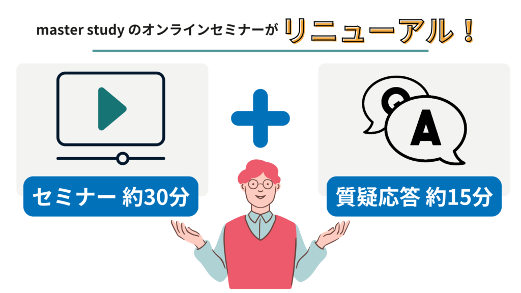 「もっとタイムリーに、最新情報やお役立ち情報をお届けしたい!」という master study 運営事務局の思いから、セミナーの開催スタイルをリニューアルいたします!
