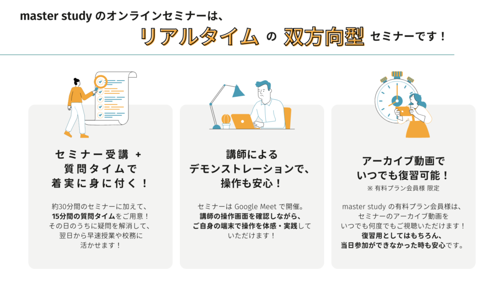 約30分間のセミナーの後には15分間の質問タイムを設け、チャットでいただいたご質問にお馴染みの master study 講師がたっぷりお答えします!