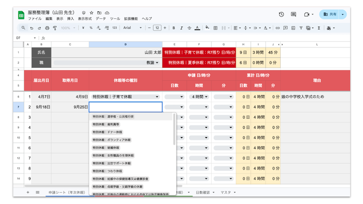 - 自動計算機能:「日数確認シート」に基づき、休暇種別(年次休暇、特別休暇、療養休暇など)に応じた残日数が自動的に計算されます。