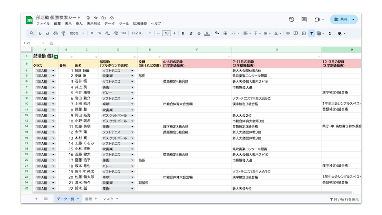 そこで、生徒の3年間の活動実績を1つのファイルに集約。検索シートに生徒名を入力するだけで該当情報が瞬時に表示される仕組みを整えました。