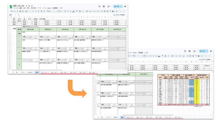 - 時数管理の自動化:先生が個別のファイルに予定を入力すると、教科ごとの実施時数や達成状況がリアルタイムで自動表示されます。